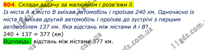 Склади задачу за малюнком і розв'яжи її. Із міста А в місто В виїхав автомобіль і проїхав 240 км. Одночасно із міста В виїхав другий автомобіль і проїхав до зустрічі з першим автомобілем 137 км. Яка відстань між містами А і В? 240 + 137 = 377 (км) Відповідь: відстань між містами 377 км.
