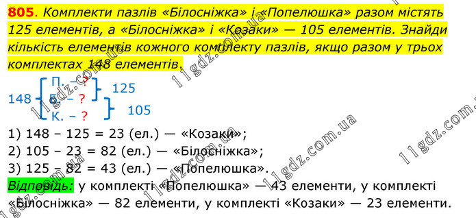 Комплекти пазлів «Білосніжка» і «Попелюшка» разом містять 125 елементів, а «Білосніжка» і «Козаки» — 105 елементів. Знайди кількість елементів кожного комплекту пазлів, якщо разом у трьох комплектах 148 елементів. П. – ? 148 Б. – ? К. – ? 1) 148 – 125 = 23 (ел.) — «Козаки»; 2) 105 – 23 = 82 (ел.) — «Білосніжка»; 3) 125 – 82 = 43 (ел.) — «Попелюшка». Відповідь: у комплекті «Попелюшка» — 43 елементи, у комплекті «Білосніжка» — 82 елементи, у комплекті «Козаки» — 23 елементи.