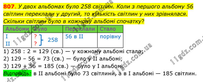 У двох альбомах було 258 світлин. Коли з першого альбому 56 світлин переклали у другий, то кількість світлин у них зрівнялася. Скільки світлин було в кожному альбомі спочатку? 1) 258 : 2 = 129 (св.) — у кожному альбомі стало; 2) 129 – 56 = 73 (св.) — було у ІІ альбомі; 3) 129 + 56 = 185 (св.) — було у І альбомі. Відповідь: в ІІ альбомі було 73 світлини, а в І альбомі — 185 світлин.