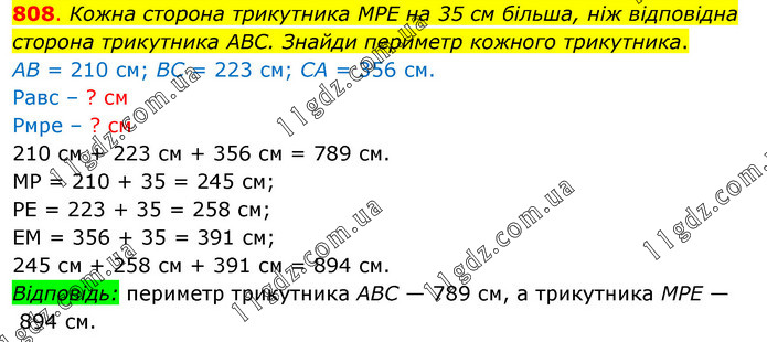 Кожна сторона трикутника МРЕ на 35 см більша, ніж відповідна сторона трикутника АВС. Знайди периметр кожного трикутника. АВ = 210 см; ВС = 223 см; СА = 356 см. Равс – ? см Рмре – ? см 210 см + 223 см + 356 см = 789 см. МР = 210 + 35 = 245 см; РЕ = 223 + 35 = 258 см; ЕМ = 356 + 35 = 391 см; 245 см + 258 см + 391 см = 894 см. Відповідь: периметр трикутника АВС — 789 см, а трикутника МРЕ — 894 см.