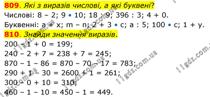 809. Які з виразів числові, а які буквені? Числові: 8 – 2; 9 • 10; 18 : 9; 396 : 3; 4 + 0. Буквенні: а + х; m – n; 2 + 3 • с; а : 5; 100 • с; 1 + у. 810. Знайди значення виразів. 200 – 1 + 0 = 199; 240 – 2 + 7 = 238 + 7 = 245; 870 – 1 – 86 = 870 – 70 – 17 = 783; 290 + 1 – 30 = 2600 + 1 = 261; 300 – 0 + 10 = 310; 460 – 1 – 10 = 450 – 1 = 449.