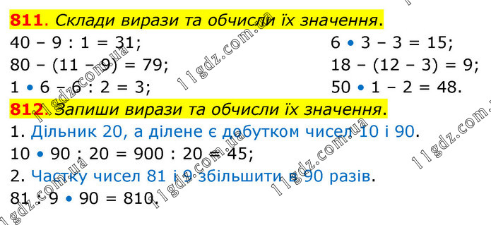 811. Склади вирази та обчисли їх значення. 40 – 9 : 1 = 31; 80 – (11 – 9) = 79; 1 • 6 – 6 : 2 = 3; 6 • 3 – 3 = 15; 18 – (12 – 3) = 9; 50 • 1 – 2 = 48. 812. Запиши вирази та обчисли їх значення. 1. Дільник 20, а ділене є добутком чисел 10 і 90. 10 • 90 : 20 = 900 : 20 = 45; 2. Частку чисел 81 і 9 збільшити в 90 разів. 81 : 9 • 90 = 810.