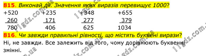 816. Чи завжди правильні рівності, що містять буквені вирази? Ні, не завжди. Все залежить від того, чому дорівнюють буквенні змінні.