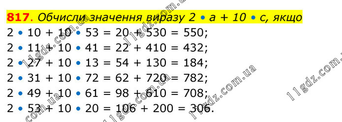 Обчисли значення виразу 2 • а + 10 • с, якщо 2 • 10 + 10 • 53 = 20 + 530 = 550; 2 • 11 + 10 • 41 = 22 + 410 = 432; 2 • 27 + 10 • 13 = 54 + 130 = 184; 2 • 31 + 10 • 72 = 62 + 720 = 782; 2 • 49 + 10 • 61 = 98 + 610 = 708; 2 • 53 + 10 • 20 = 106 + 200 = 306.
