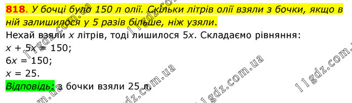 У бочці було 150 л олії. Скільки літрів олії взяли з бочки, якщо в ній залишилося у 5 разів більше, ніж узяли. Нехай взяли x літрів, тоді лишилося 5x. Складаємо рівняння: x + 5x = 150; 6x = 150; x = 25. Відповідь: з бочки взяли 25 л.