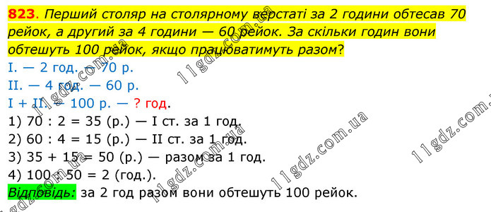 Перший столяр на столярному верстаті за 2 години обтесав 70 рейок, а другий за 4 години — 60 рейок. За скільки годин вони обтешуть 100 рейок, якщо працюватимуть разом? І. — 2 год. — 70 р. ІІ. — 4 год. — 60 р. І + ІІ. — 100 р. — ? год. 1) 70 : 2 = 35 (р.) — І ст. за 1 год. 2) 60 : 4 = 15 (р.) — ІІ ст. за 1 год. 3) 35 + 15 = 50 (р.) — разом за 1 год. 4) 100 : 50 = 2 (год.). Відповідь: за 2 год разом вони обтешуть 100 рейок.