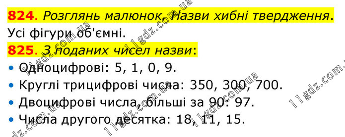 824. Розглянь малюнок. Назви хибні твердження. Усі фігури об'ємні. 825. З поданих чисел назви: • Одноцифрові: 5, 1, 0, 9. • Круглі трицифрові числа: 350, 300, 700. • Двоцифрові числа, більші за 90: 97. • Числа другого десятка: 18, 11, 15.