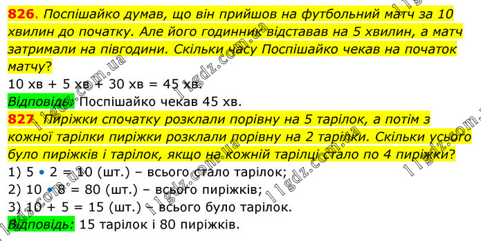 826. Поспішайко думав, що він прийшов на футбольний матч за 10 хвилин до початку. Але його годинник відставав на 5 хвилин, а матч затримали на півгодини. Скільки часу Поспішайко чекав на початок матчу? 10 хв + 5 хв + 30 хв = 45 хв. Відповідь: Поспішайко чекав 45 хв. 827. Пиріжки спочатку розклали порівну на 5 тарілок, а потім з кожної тарілки пиріжки розклали порівну на 2 тарілки. Скільки усього було пиріжків і тарілок, якщо на кожній тарілці стало по 4 пиріжки? 1) 5 • 2 = 10 (шт.) – всього стало тарілок; 2) 10 • 8 = 80 (шт.) – всього пиріжків; 3) 10 + 5 = 15 (шт.) – всього було тарілок. Відповідь: 15 тарілок і 80 пиріжків.