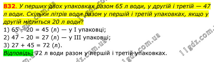 У перших двох упаковках разом 65 л води, у другій і третій — 47 л води. Скільки літрів води разом у першій і третій упаковках, якщо у другій міститься 20 л води? 1) 65 – 20 = 45 (л) — у І упаковці; 2) 47 – 20 = 27 (л) — у ІІІ упаковці; 3) 27 + 45 = 72 (л). Відповідь: 72 л води разом у першій і третій упаковках.
