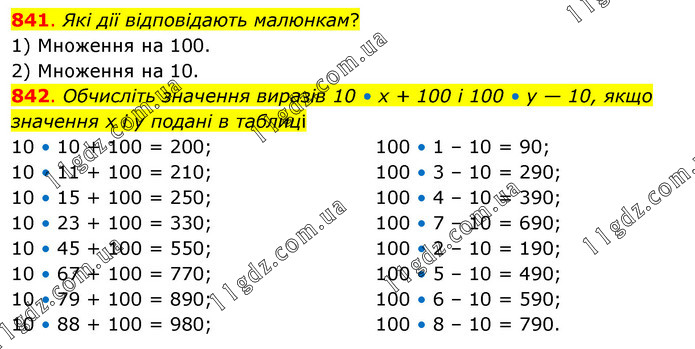 841. Які дії відповідають малюнкам? 1) Множення на 100. 2) Множення на 10. 842. Обчисліть значення виразів 10 • х + 100 і 100 • у — 10, якщо значення х і у подані в таблиці 10 • 10 + 100 = 200; 10 • 11 + 100 = 210; 10 • 15 + 100 = 250; 10 • 23 + 100 = 330; 10 • 45 + 100 = 550; 10 • 67 + 100 = 770; 10 • 79 + 100 = 890; 10 • 88 + 100 = 980; 100 • 1 – 10 = 90; 100 • 3 – 10 = 290; 100 • 4 – 10 = 390; 100 • 7 – 10 = 690; 100 • 2 – 10 = 190; 100 • 5 – 10 = 490; 100 • 6 – 10 = 590; 100 • 8 – 10 = 790.