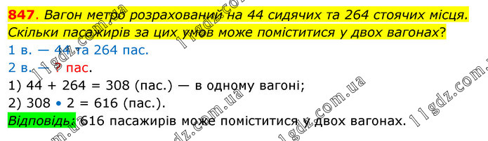 Вагон метро розрахований на 44 сидячих та 264 стоячих місця. Скільки пасажирів за цих умов може поміститися у двох вагонах? 1 в. — 44 та 264 пас. 2 в. — ? пас. 1) 44 + 264 = 308 (пас.) — в одному вагоні; 2) 308 • 2 = 616 (пас.). Відповідь: 616 пасажирів може поміститися у двох вагонах.
