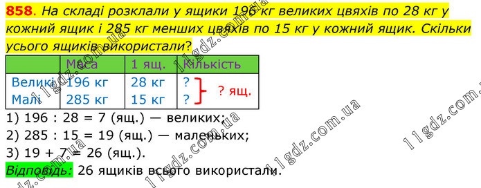 На складі розклали у ящики 196 кг великих цвяхів по 28 кг у кожний ящик і 285 кг менших цвяхів по 15 кг у кожний ящик. Скільки усього ящиків використали? 1) 196 : 28 = 7 (ящ.) — великих; 2) 285 : 15 = 19 (ящ.) — маленьких; 3) 19 + 7 = 26 (ящ.). Відповідь: 26 ящиків всього використали.
