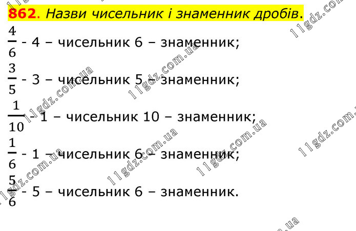 Назви чисельник і знаменник дробів. 4/6 - 4 – чисельник 6 – знаменник; 3/5 - 3 – чисельник 5 – знаменник; 1/10 - 1 – чисельник 10 – знаменник; 1/6 - 1 – чисельник 6 – знаменник; 5/6 - 5 – чисельник 6 – знаменник.