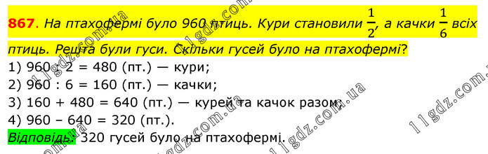 На птахофермі було 960 птиць. Кури становили 1/2, а качки 1/6 всіх птиць. Решта були гуси. Скільки гусей було на птахофермі? 1) 960 : 2 = 480 (пт.) — кури; 2) 960 : 6 = 160 (пт.) — качки; 3) 160 + 480 = 640 (пт.) — курей та качок разом; 4) 960 – 640 = 320 (пт.). Відповідь: 320 гусей було на птахофермі.