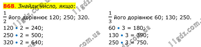 Знайди число, якщо: 1/2 його дорівнює 120; 250; 320. 120 • 2 = 240; 250 • 2 = 500; 320 • 2 = 640; 1/3 його дорівнює 60; 130; 250. 60 • 3 = 180; 130 • 3 = 390; 250 • 3 = 750.