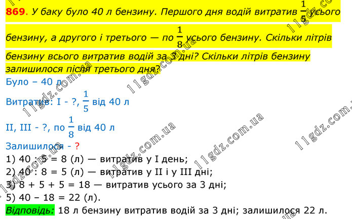 У баку було 40 л бензину. Першого дня водій витратив 1/5 усього бензину, а другого і третього — по 1/8 усього бензину. Скільки літрів бензину всього витратив водій за 3 дні? Скільки літрів бензину залишилося після третього дня? Було – 40 л Витратив: І - ?, 1/5 від 40 л ІІ, ІІІ - ?, по 1/8 від 40 л Залишилося - ? 1) 40 : 5 = 8 (л) — витратив у І день; 2) 40 : 8 = 5 (л) — витратив у ІІ і у ІІІ дні; 3) 8 + 5 + 5 = 18 — витратив усього за 3 дні; 5) 40 – 18 = 22 (л). Відповідь: 18 л бензину витратив водій за 3 дні; залишилося 22 л.
