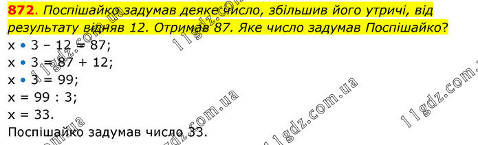 Поспішайко задумав деяке число, збільшив його утричі, від результату відняв 12. Отримав 87. Яке число задумав Поспішайко? х • 3 – 12 = 87; х • 3 = 87 + 12; х • 3 = 99; х = 99 : 3; х = 33. Поспішайко задумав число 33.