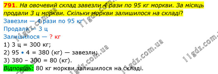 На овочевий склад завезли 4 рази по 95 кг моркви. За місяць продали 3 ц моркви. Скільки моркви залишилося на складі? Завезли — 4 рази по 95 кг Продали — 3 ц Залишилося — ? кг 1) 3 ц = 300 кг; 2) 95 • 4 = 380 (кг) — завезли; 3) 380 – 300 = 80 (кг). Відповідь: 80 кг моркви залишилося на складі.
