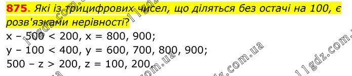 Які із трицифрових чисел, що діляться без остачі на 100, є розв'язками нерівності? х – 500 < 200, х = 800, 900; у – 100 < 400, у = 600, 700, 800, 900; 500 – z > 200, z = 100, 200.