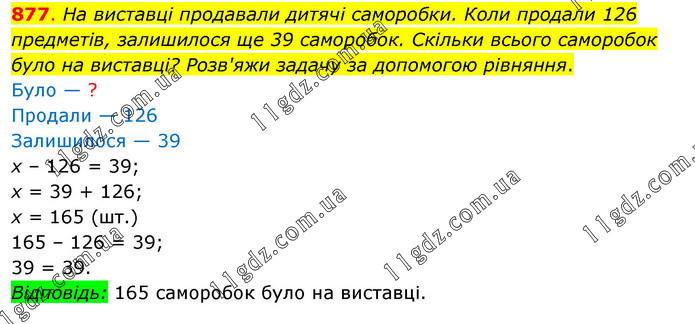 На виставці продавали дитячі саморобки. Коли продали 126 предметів, залишилося ще 39 саморобок. Скільки всього саморобок було на виставці? Розв'яжи задачу за допомогою рівняння. Було — ? Продали — 126 Залишилося — 39 х – 126 = 39; х = 39 + 126; х = 165 (шт.) 165 – 126 = 39; 39 = 39. Відповідь: 165 саморобок було на виставці.