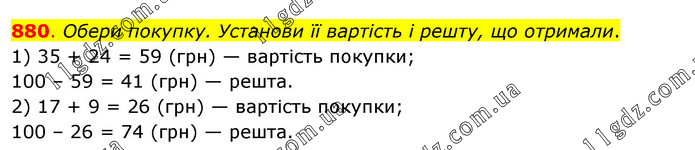 Обери покупку. Установи її вартість і решту, що отримали. 1) 35 + 24 = 59 (грн) — вартість покупки; 100 – 59 = 41 (грн) — решта. 2) 17 + 9 = 26 (грн) — вартість покупки; 100 – 26 = 74 (грн) — решта.