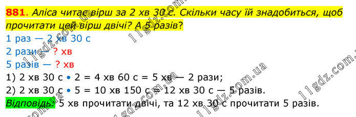 Аліса читає вірш за 2 хв 30 с. Скільки часу їй знадобиться, щоб прочитати цей вірш двічі? А 5 разів? 1 раз — 2 хв 30 с 2 рази — ? хв 5 разів — ? хв 1) 2 хв 30 с • 2 = 4 хв 60 с = 5 хв — 2 рази; 2) 2 хв 30 с • 5 = 10 хв 150 с = 12 хв 30 с — 5 разів. Відповідь: 5 хв прочитати двічі, та 12 хв 30 с прочитати 5 разів.
