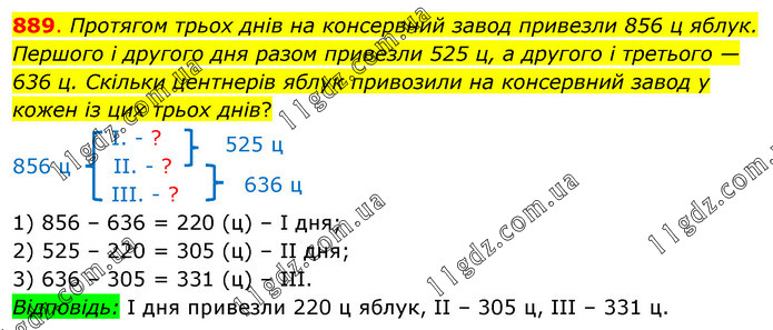 Протягом трьох днів на консервний завод привезли 856 ц яблук. Першого і другого дня разом привезли 525 ц, а другого і третього — 636 ц. Скільки центнерів яблук привозили на консервний завод у кожен із цих трьох днів? І. - ? 856 ц ІІ. - ? ІІІ. - ? 1) 856 – 636 = 220 (ц) – І дня; 2) 525 – 220 = 305 (ц) – ІІ дня; 3) 636 – 305 = 331 (ц) – ІІІ. Відповідь: І дня привезли 220 ц яблук, ІІ – 305 ц, ІІІ – 331 ц.