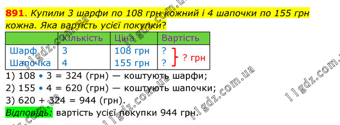 Купили 3 шарфи по 108 грн кожний і 4 шапочки по 155 грн кожна. Яка вартість усієї покупки? 1) 108 • 3 = 324 (грн) — коштують шарфи; 2) 155 • 4 = 620 (грн) — коштують шапочки; 3) 620 + 324 = 944 (грн). Відповідь: вартість усієї покупки 944 грн.