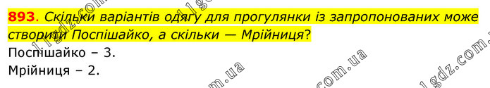 Скільки варіантів одягу для прогулянки із запропонованих може створити Поспішайко, а скільки — Мрійниця? Поспішайко – 3. Мрійниця – 2.
