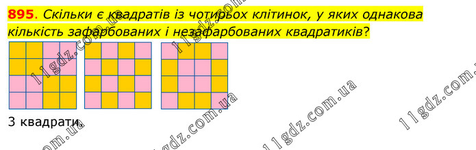 Скільки є квадратів із чотирьох клітинок, у яких однакова кількість зафарбованих і незафарбованих квадратиків? 3 квадрати.