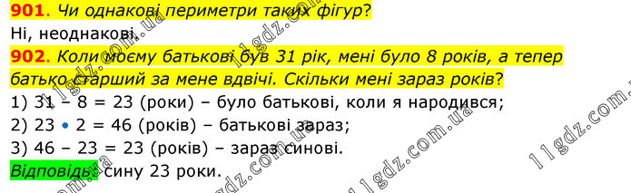 901. Чи однакові периметри таких фігур? Ні, неоднакові. 902. Коли моєму батькові був 31 рік, мені було 8 років, а тепер батько старший за мене вдвічі. Скільки мені зараз років? 1) 31 – 8 = 23 (роки) – було батькові, коли я народився; 2) 23 • 2 = 46 (років) – батькові зараз; 3) 46 – 23 = 23 (років) – зараз синові. Відповідь: сину 23 роки.