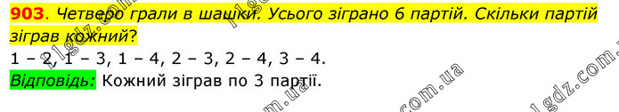 Четверо грали в шашки. Усього зіграно 6 партій. Скільки партій зіграв кожний? 1 – 2, 1 – 3, 1 – 4, 2 – 3, 2 – 4, 3 – 4. Відповідь: Кожний зіграв по 3 партії.