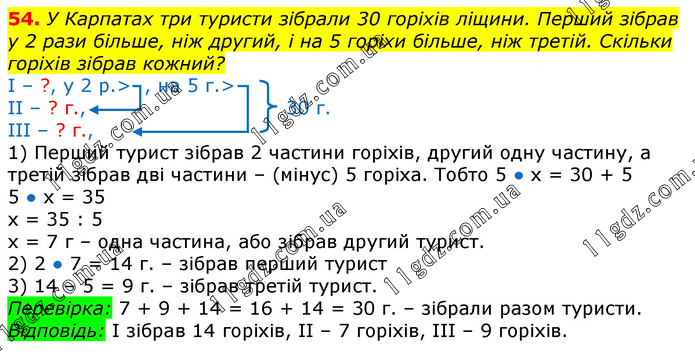 У Карпатах три туристи зібрали 30 горіхів ліщини. Перший зібрав у 2 рази більше, ніж другий, і на 2 горіхи більше, ніж третій. Скільки горіхів зібрав кожний?