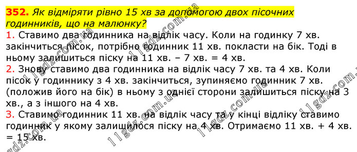 Як відміряти рівно 15 хв за допомогою двох пісочних годинників 7 хв та 11 хв, що на малюнку?