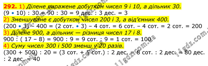 1) Ділене виражене добутком чисел 9 і 10, а дільник 30. 2) Зменшуване є добутком чисел 200 і 3, а від’ємник 400. 3) Ділене 900, а дільник — різниця чисел 17 і 8. 4) Суму чисел 300 і 500 зменш у 20 разів.