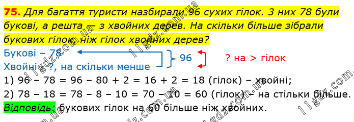 Для багаття туристи назбирали 96 сухих гілок. 3 них 78 були букові, а решта — з хвойних дерев. На скільки більше зібрали букових гілок, ніж гілок хвойних дерев? Букові – 78 Хвойні - ?, на скільки менше 1) 96 – 78 = 96 – 80 + 2 = 16 + 2 = 18 (гілок) – хвойні; 2) 78 – 18 = 78 – 8 – 10 = 70 – 10 = 60 (гілок) – на стільки більше. Відповідь: букових гілок на 60 більше ніж хвойних.