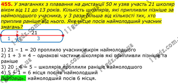 У змаганнях з плавання на дистанції 50 м узяв участь 21 школяр віком від 11 до 13 років. Кількість школярів, які припливли пізніше за наймолодшого учасника, у 3 рази більша від кількості тих, хто приплив раніше від нього. Яке місце посів наймолодший учасник змагань?