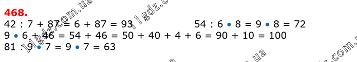 42 : 7 + 87 = 6 + 87 = 93 54 : 6 • 8 = 9 • 8 = 72 9 • 6 + 46 = 54 + 46 = 50 + 40 + 4 + 6 = 90 + 10 = 100 81 : 9 • 7 = 9 • 7 = 63