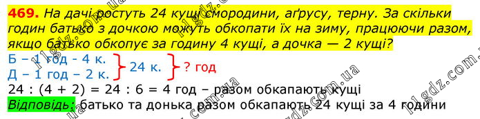 На дачі ростуть 24 кущі смородини, аґрусу, терну. За скільки годин батько з дочкою можуть обкопати їх на зиму, працюючи разом, якщо батько обкопує за годину 4 кущі, а дочка — 2 кущі?