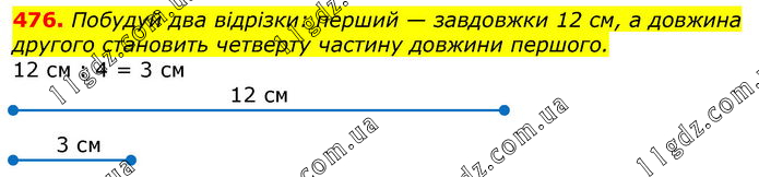 Побудуй два відрізки: перший — завдовжки 12 см, а довжина другого становить четверту частину довжини першого.