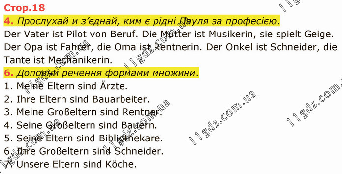 Прослухай и з’єднай, ким є рідні Пауля за професією. Der Vater ist Pilot von Beruf. Die Mutter ist Musikerin, sie spielt Geige. Der Opa ist Fahrer, die Oma ist Rentnerin. Der Onkel ist Schneider, die Tante ist Mechanikerin. 6. Доповни речення формами множини. 1. Meine Eltern sind Ärzte. 2. Ihre Eltern sind Bauarbeiter. 3. Meine Großeltern sind Rentner. 4. Seine Großeltern sind Bauern. 5. Seine Eltern sind Bibliothekare. 6. Ihre Großeltern sind Schneider. 7. Unsere Eltern sind Köche.