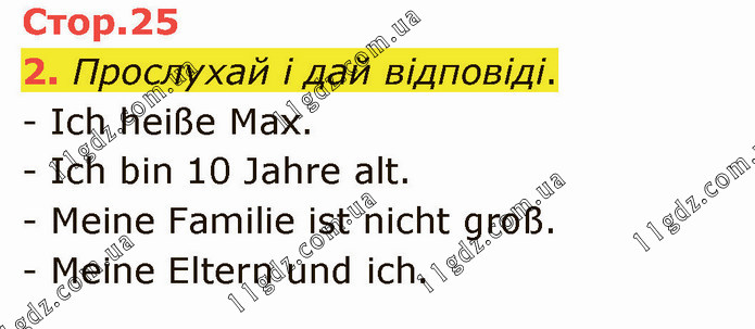 Прослухай і дай відповіді. - Ich heiße Max. - Ich bin 10 Jahre alt. - Meine Familie ist nicht groß. - Meine Eltern und ich.