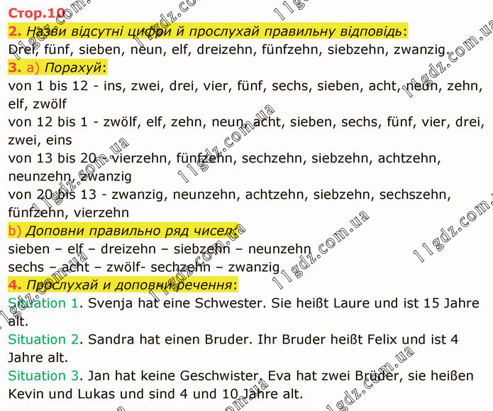 Назви відсутні цифри й прослухай правильну відповідь: Drei, fünf, sieben, neun, elf, dreizehn, fünfzehn, siebzehn, zwanzig. 3. a) Порахуй: von 1 bis 12 - ins, zwei, drei, vier, fünf, sechs, sieben, acht, neun, zehn, elf, zwölf von 12 bis 1 - zwölf, elf, zehn, neun, acht, sieben, sechs, fünf, vier, drei, zwei, eins von 13 bis 20 - vierzehn, fünfzehn, sechzehn, siebzehn, achtzehn, neunzehn, zwanzig von 20 bis 13 - zwanzig, neunzehn, achtzehn, siebzehn, sechszehn, fünfzehn, vierzehn b) Доповни правильно ряд чисел: sieben – elf – dreizehn – siebzehn – neunzehn sechs – acht – zwölf- sechzehn – zwanzig 4. Прослухай и доповни речення: Situation 1. Svenja hat eine Schwester. Sie heißt Laure und ist 15 Jahre alt. Situation 2. Sandra hat einen Bruder. Ihr Bruder heißt Felix und ist 4 Jahre alt. Situation 3. Jan hat keine Geschwister. Eva hat zwei Brüder, sie heißen Kevin und Lukas und sind 4 und 10 Jahre alt.