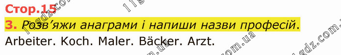 Розв’яжи анаграми і напиши назви професій. Arbeiter. Koch. Maler. Bäcker. Arzt.