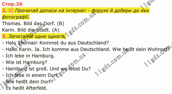 б) Прочитай дописи на інтернет - форумі й добери до них фотографїї. Thomas. Bild das Dorf. (В) Karin. Bild die Stadt. (А) 3. Запитайте одне одного. - Halo Thomas! Kommst du aus Deutschland? - Hallo Karin. Ja. Ich komme aus Deutschland. Wie heißt dein Wohnort? - Ich lebe in Hamburg. - Wie ist Hamburg? - Hamburg ist groß. Und wo lebst Du? - Ich lebe in einem Dorf. - Wie heißt dein Dorf? - Es heißt Afterfeld.