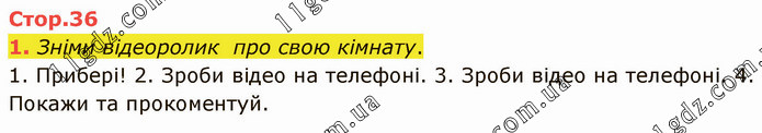 Зніми відеоролик про свою кімнату. 1. Прибері! 2. Зроби відео на телефоні. 3. Зроби відео на телефоні. 4. Покажи та прокоментуй.
