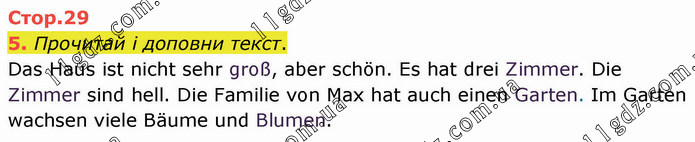 Прочитай і доповни текст. Das Haus ist nicht sehr groß, aber schön. Es hat drei Zimmer. Die Zimmer sind hell. Die Familie von Max hat auch einen Garten. Im Garten wachsen viele Bäume und Blumen.