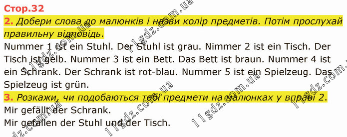 Добери слова до малюнків і назви колір предметів. Потім прослухай правильну відповідь. Nummer 1 ist ein Stuhl. Der Stuhl ist grau. Nimmer 2 ist ein Tisch. Der Tisch ist gelb. Nummer 3 ist ein Bett. Das Bett ist braun. Nummer 4 ist ein Schrank. Der Schrank ist rot-blau. Nummer 5 ist ein Spielzeug. Das Spielzeug ist grün. 3. Розкажи, чи подобаються тобі предмети на малюнках у вправі 2. Mir gefällt der Schrank. Mir gefallen der Stuhl und der Tisch.