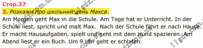 Розкажи про шкільний день Макса. Am Morgen geht Max in die Schule. Am Tage hat er Unterricht. In der Schule liest, spricht und malt Max. Nach der Schule fährt er nach Hause. Er macht Hausaufgaben, spielt und geht mit dem Hund spazieren. Am Abend liest er ein Buch. Um 9 Uhr geht er schlafen.