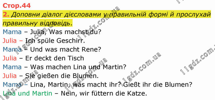 Доповни діалог дієсловами у правильній формі й прослухай правильну відповідь. Mama – Julia, Was machst du? Julia – Ich spüle Geschirr. Mama – Und was macht Rene? Julia – Er deckt den Tisch Mama – Was machen Lina und Martin? Julia – Sie gießen die Blumen. Mama – Lina, Martin, was macht ihr? Gießt ihr die Blumen? Lina und Martin – Nein, wir füttern die Katze.